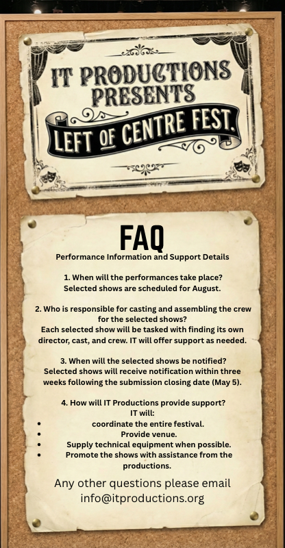 IT Productions is bringing back the beloved “Left of Centre Fest.” A celebration of one acts from various playwrights and directors!!!